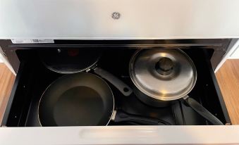 Essential kitchenware, including a pot, pan, rice cooker, electric cooktop, stove, microwave, and refrigerator. A coffee maker and toaster are also provided.