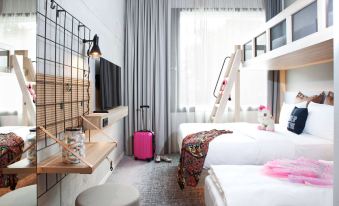 Habitación familiar Moxy con 1 cama grande, sofá cama y vista al interior