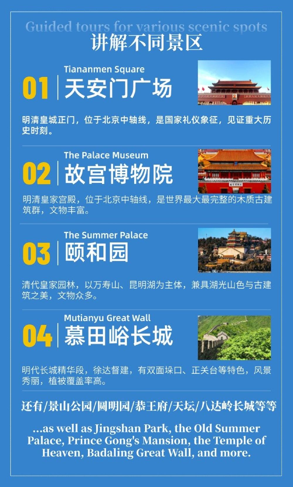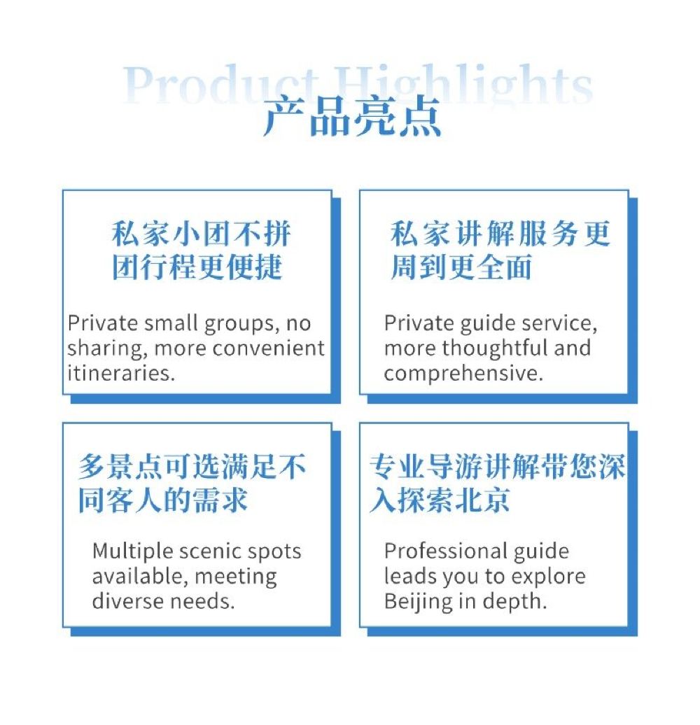 Servicio de guía personalizado en chino, inglés, cantonés, francés, español y otros idiomas, con visita guiada con explicaciones durante todo el recorrido; guías certificados, con amplia experiencia y conocimientos profundos, que enriquecen el conocimiento histórico y las experiencias.