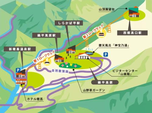 Con una longitud total de 3.200 metros y un desnivel de 1.039 metros, el teleférico se divide en dos tramos y ofrece impresionantes vistas de las montañas nevadas de Hida, conocidas como los "Alpes del Norte". El paisaje cambia con las estaciones: en primavera, los cerezos en flor tiñen de rosa las laderas; en verano, los bosques rebosan de verdor; en otoño, los arces despliegan un mosaico de colores, y en invierno, todo se transforma en un mágico reino blanco.